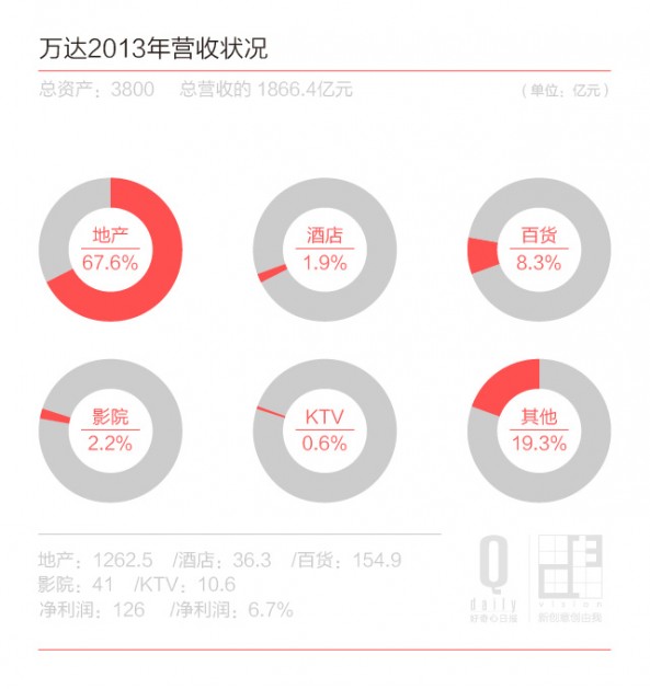 2013 年,万达集团资产达到 3800 亿元,同比增长 27%;营收 1866.4 亿元,同比增长 31%。你可以从下图看到几个核心业务的营收占比。
