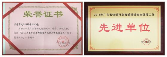 3月,速尔快递有限公司荣获“2016年广东省快递行业寄递渠道安全保障工作先进单位”荣誉称号;与此同时,速尔快递华南大区总经理冯川、速尔快递总部总经办张永生等3名员工荣获“2016年广东省快递行业寄递渠道安全保障工作先进个人”;速尔快递有限公司旗下东莞市速尔运输有限公司荣获“2016年度广东省邮政行业统计工作先进企业”荣誉称号。