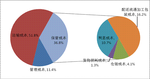 调查企业汇总数据显示,在物流成本构成中,运输成本占51.8%,比上年同期下降1.8个百分点;保管成本占36.8%,提高0.6个百分点;管理成本占11.4%,提高2.4个百分点。