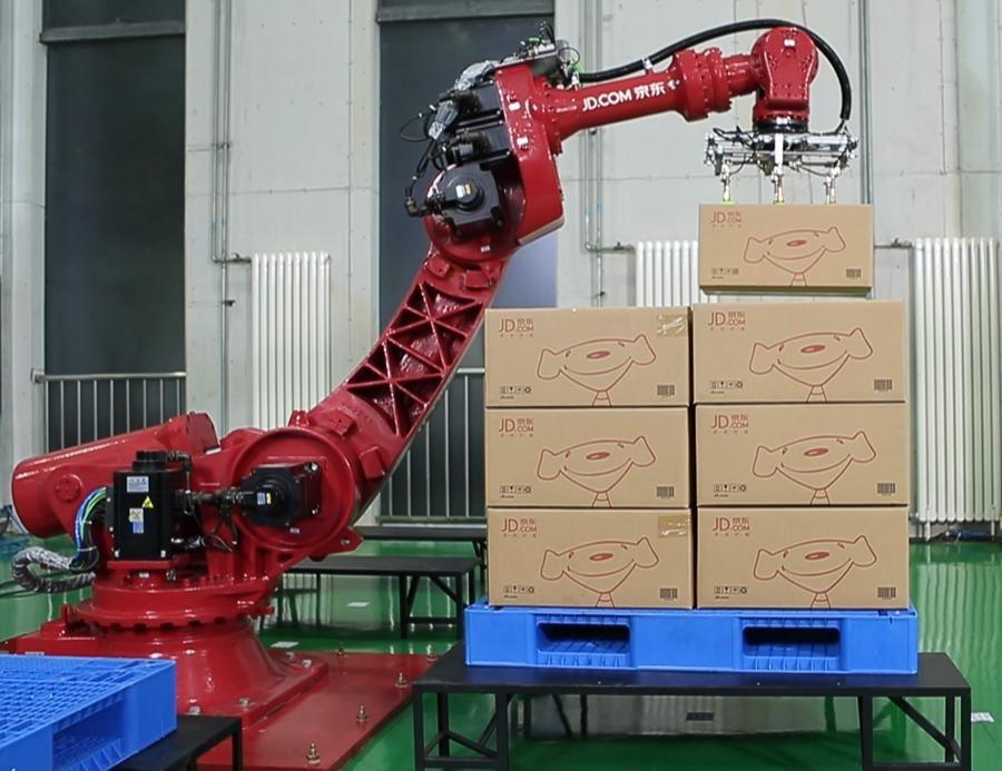 ④ 六轴机器人6-AXIS:它几乎就是每个人心目中的经典机械手,由控制、驱动、机械本体等单元组成,是个勤勤恳恳的搬运工,负责拆码垛等工作,具有165kg大载荷量和±0.05mm高精度的特点。