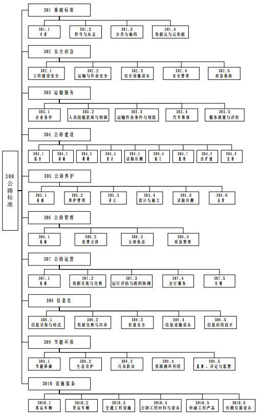 基础标准包含术语、符号与标识、分类与编码等;安全应急标准包含道路工程建设安全、道路运输与作业安全、安全管理、应急救助等;运输服务标准包含道路运输作业条件与规范、汽车维修、服务质量与评价等;公路建设标准包括勘测、设计、施工、监理、改扩建、造价等;公路养护标准包括养护管理、评定、设计与施工等;公路管理标准包括收费公路、公路执法等;公路运营标准包括运行评估与组织协调、出行服务等;信息化标准包含信息采集与格式、数据交换与共享等;节能环保标准包含生态保护、污染防治等;设施装备标准包含运输车辆、交通工程设施产品等标准。