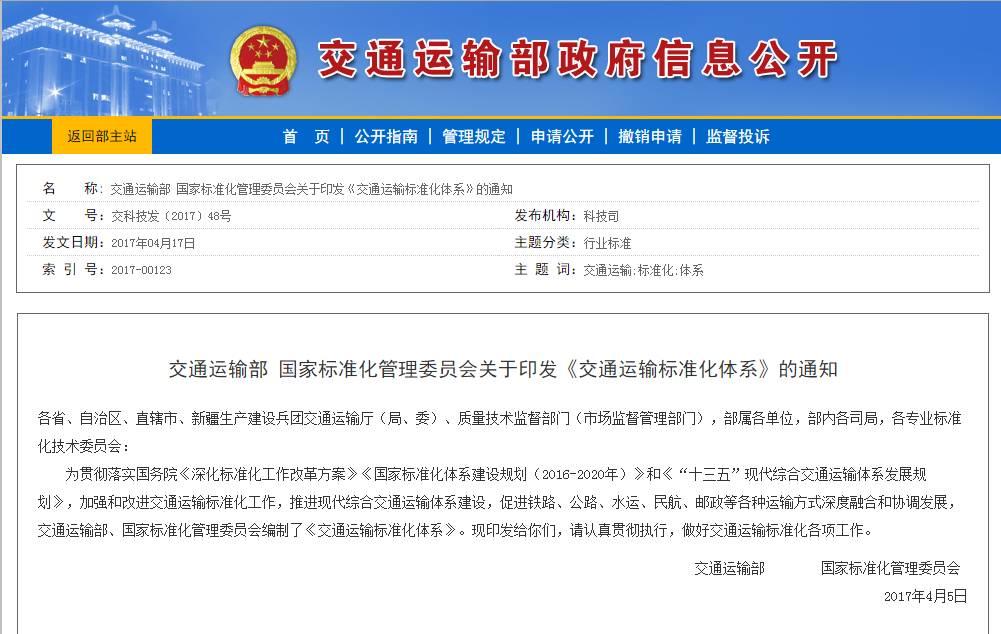 而4月17日《交通运输标准化体系》一经印发,便在各大物流细分领域引起广泛关注。