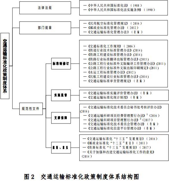 交通运输标准化政策制度体系包括《中华人民共和国标准化法》《中华人民共和国标准化法实施条例》等法律法规、部门规章及规范性文件。