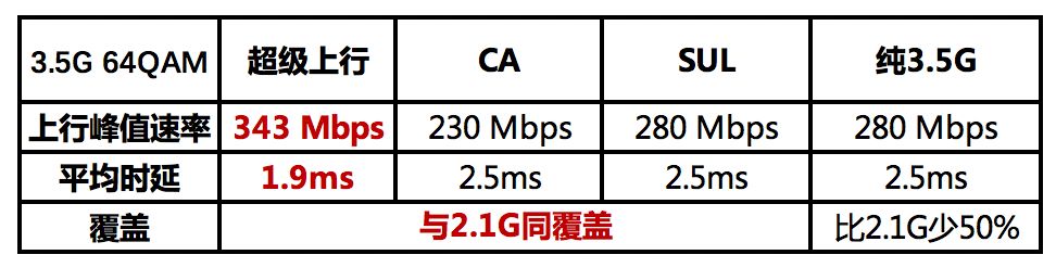 从速率上分析,3.5G 64QAM上行峰值约为280Mbps,2.1G 64QAM上行速率约为90Mbps。超级上行打开后,理论上行峰值速率可达到280+0.7*90=343Mbps,速率提升20%。