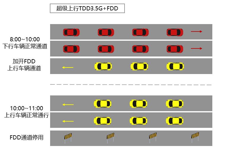 这就相当于加开了一条FDD上行车道,从此上行车辆不用分时段限行,全时段畅通无阻。