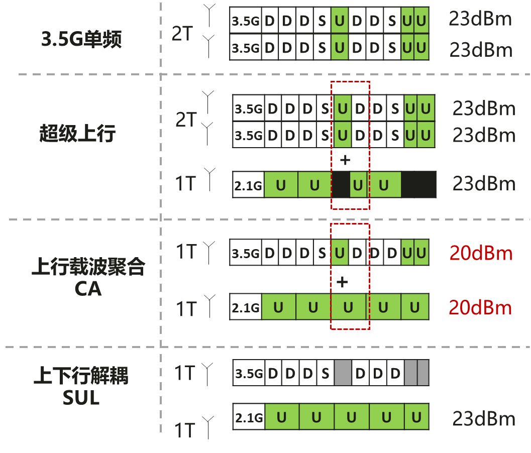 上行CA:在3.5G基础上增开低频通道做上行,让流量同时承载于高频段+低频段,提升覆盖和体验。但CA技术存在两大问题:一是两个频段上行只能各占一个通道,导致3.5G频段无法充分发挥双通道大带宽优势,同时每个通道功率小于20dbm,导致上行收缩3dB,二是终端产业发展缓慢,目前无TDD+FDD上行载波聚合的终端并无任何实现路标。