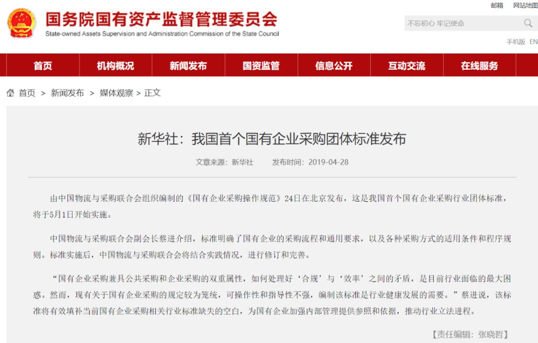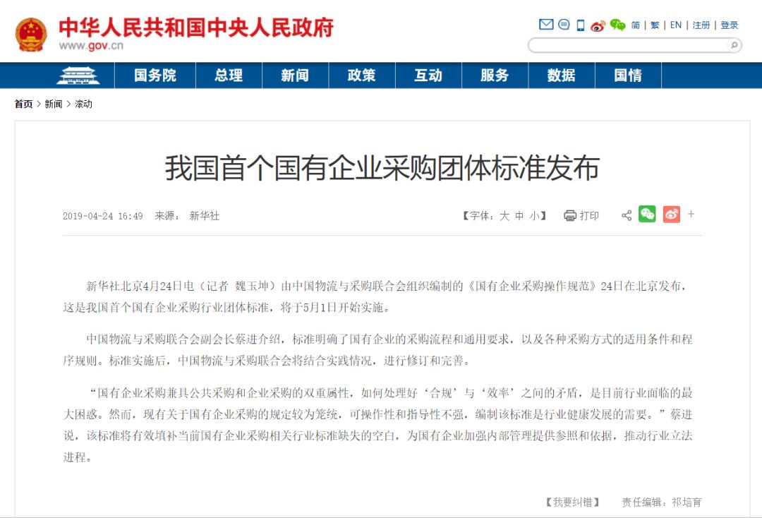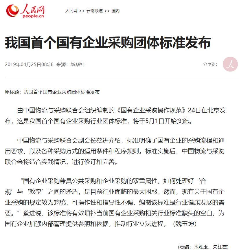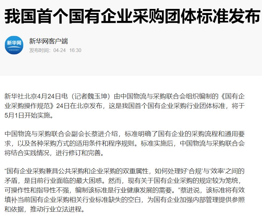 2019年4月24日,《国有企业采购操作规范》团体标准由中国物流与采购联合会发布,自2019年5月1日开始实施。该规范适用于广大国有企业的采购管理与执行机构组织及其从业人员;除依法必须进行招标的采购项目以外,其他自愿进行招标、非招标,以及招标失败后依法不再招标的各种采购活动,均可采用该规范的两种采购组织形式、九种采购方式。