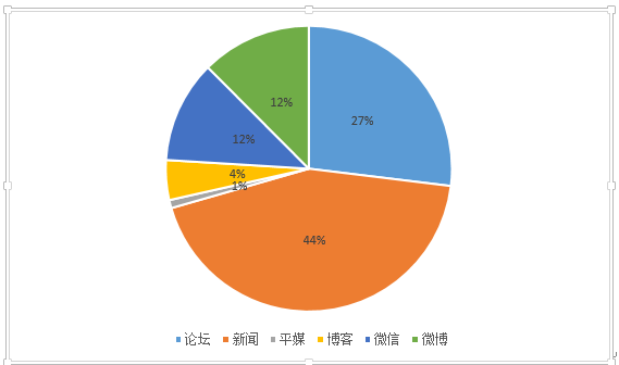 媒体分类上,新闻类传播占比最高,占总传播量的44%;其次是论坛、微博和微信分别占传播量的27%、12%和12%;博客、平媒则分别占总传播量的4%,1%。